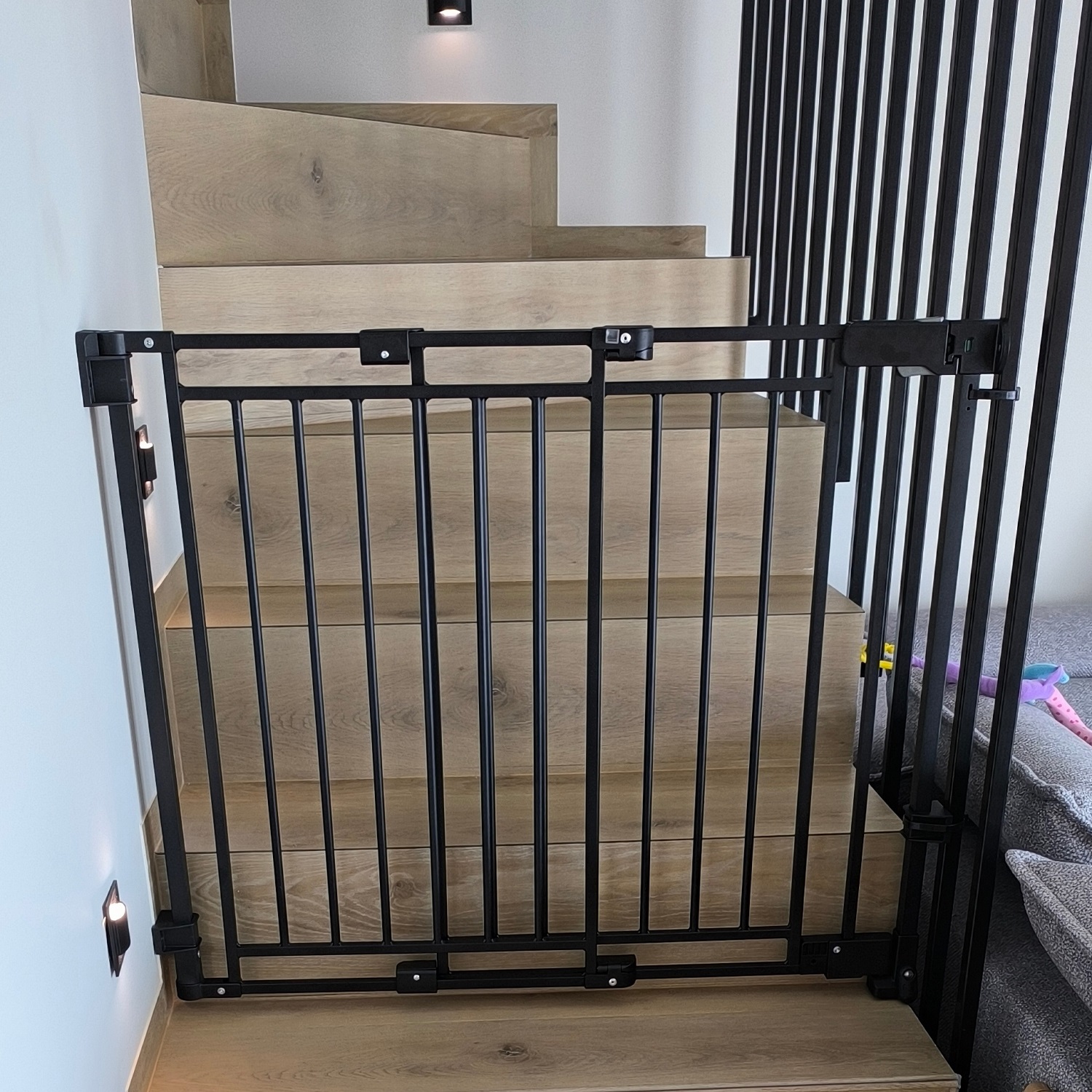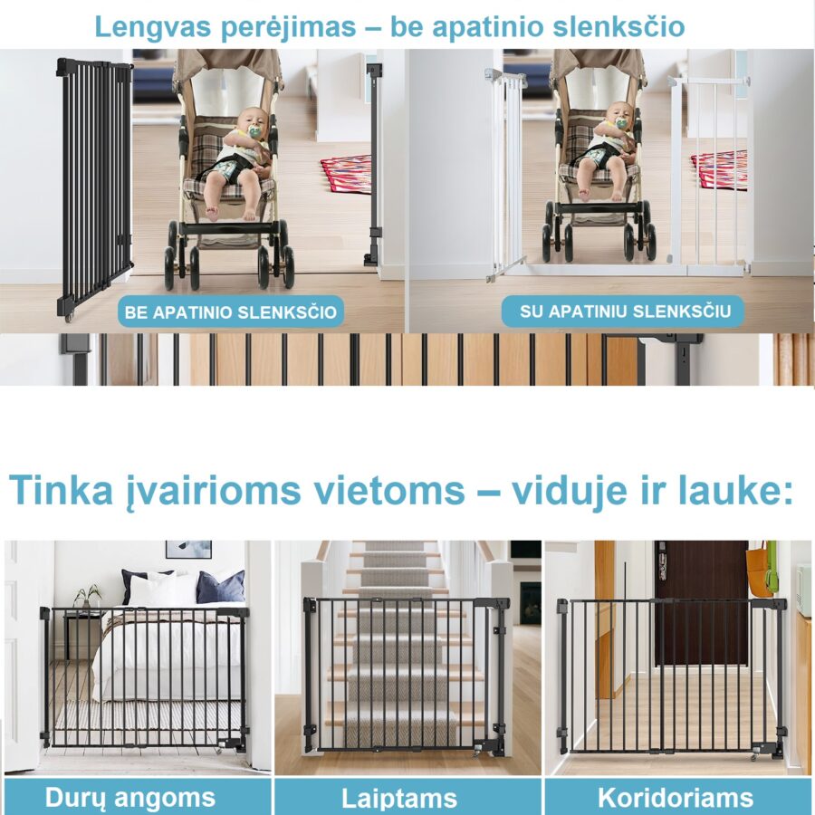 Šie juodi apsauginiai varteliai yra patikimas sprendimas tėvams, siekiantiems sukurti saugią aplinką vaikams. Varteliai prisitaiko prie įvairių erdvių – jų plotis reguliuojamas nuo 74 iki 110 cm, o tai leidžia montuoti juos prie durų, laiptų ar perėjimų be papildomų plėtimo elementų.